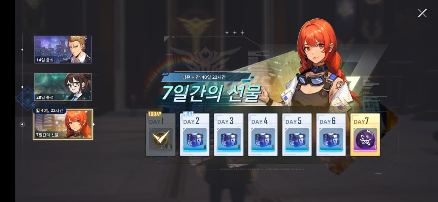 ✅위의 사진과 같이 출석 보상을 받을 수 있게 되면 튜토리얼이 모두 끝이 난 것입니다. 14일 출석, 28일 출석, 7일간의 선물을 모두 받아줍니다.