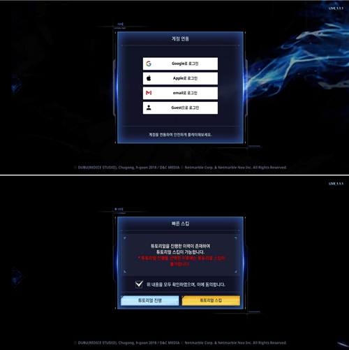 ✅옵션 → 계정 설정 → 계정 초기화를 진행해 줍니다. 계정 초기화가 완료되면 다시 처음과 같이 어떤 계정으로 플레이할 것인지를 선택할 수 있는 화면이 나옵니다. 마찬가지 게스트 계정을 선택하시고 넘어가게 되면 '튜토리얼을 진행한 이력이 존재하여 튜토리얼 스킵이 가능합니다'라는 문구가 나오며 튜토리얼 스킵이 가능해집니다.