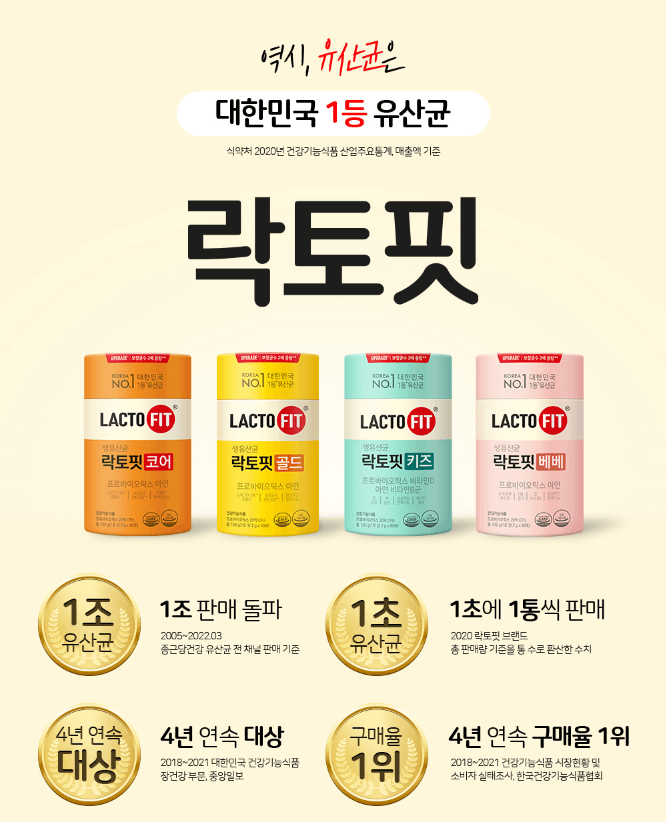 종근당건강에서 만든 락토핏은 식약처 2020년 건강기능식품 산업주요 통계, 매출액 기준 대한민국 1등 유산균입니다.