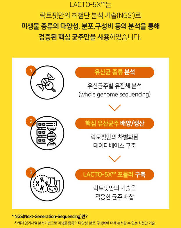 LACTO-5X™는 락토핏만의 최첨단 분석 기술(NGS)로 미생물 종류의 다양성, 분포, 구성비 등의 분석을 통해 검증된 핵심 균주만을 사용하였습니다.