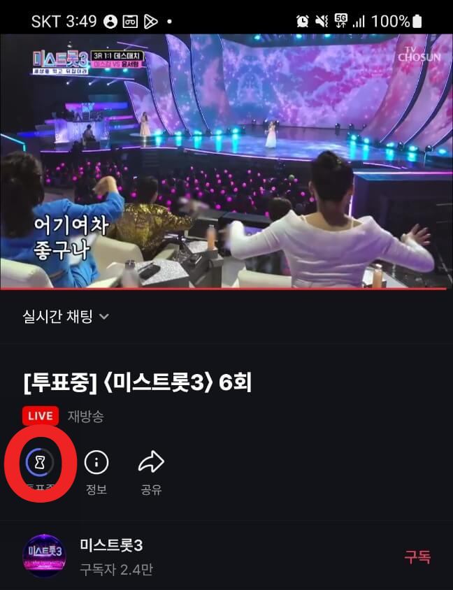 미스트롯3 채널에 접속해서 투표 중인 LIVE 방송을 클릭하여 화면 영상 아래 모래시계 모양을 클릭합니다.