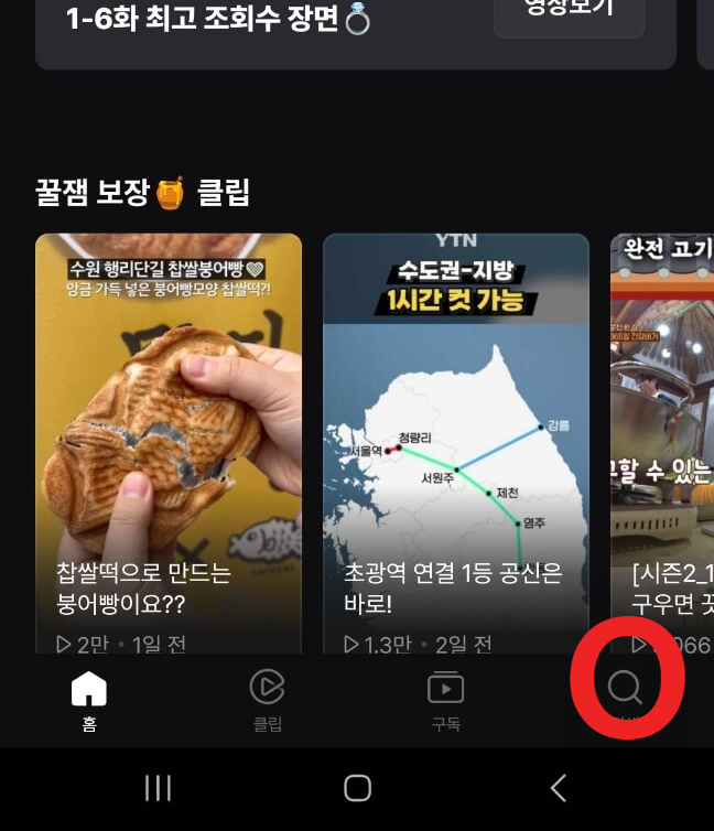 오른쪽 하단의 돋보기 모양을 눌러서 검색탭으로 들어가 주세요.
