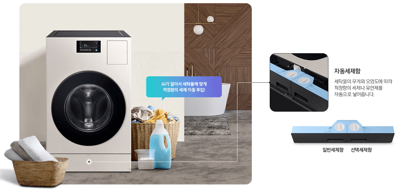 세탁기와 건조기 일체형 모델이니 만큼 세탁이 완료된 세탁물을 건조기로 옮기는 절차가 자동으로 이루어져 사용에 매우 편리해졌습니다. 또한 세탁할 때마다 세제를 넣을 필요 없이 자동세제함에 세제를 채워 놓으면 세탁 시에 알맞은 용량으로 세제를 투입해 주는 기능도 추가되었습니다. 자동세제함은 가득 채울 경우 6주간 사용이 가능합니다.
