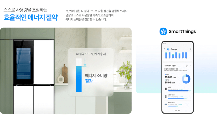 기존 컴프레서랑은 달리 AI 인버터 컴프레서의 장착으로 설정온도까지 금세 도달하기 때문에 에너지를 절약할 수 있습니다. 그만큼 전기요금도 줄어듭니다. 또한 SmartThings AI 절약모드를 통해 에너지 소비량을 1단계는 15%, 2단계는 25%까지 선택하여 절감할 수 있습니다.