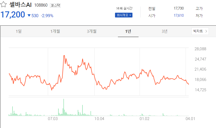 위 표는 셀바스 AI의 1년간 가격 변화 그래프입니다 2023년 8월경 25,000원을 육박하던 주가가 현재는 15,000원 정도까지 조정을 받고 있습니다.