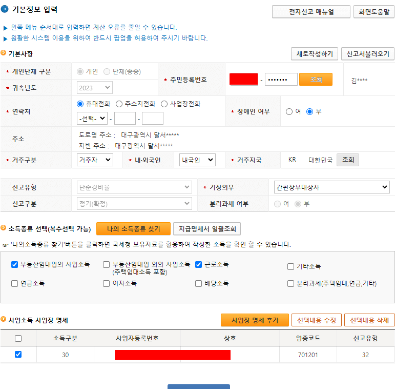 개인정보를 입력하고 조회를 누르게 되면 신고해야 되는 소득의 종류가 자동으로 체크됩니다.