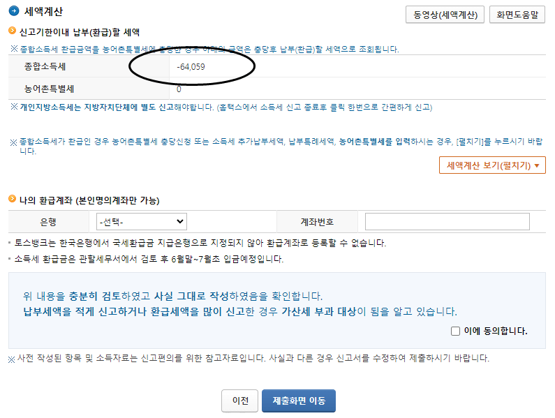 일반신고를 통해 계산된 최종 세액은 -64,059원입니다. 처음 모두 채움을 통해서 안내받은 864,650원에 비해서 무려 90만 원 가까이 절세를 했습니다. 일반신고 절차가 복잡해 보이지만 막상 해보시면 홈택스 전산에 있는 데이터를 불러오기 때문에 간단하게 신고를 할 수 있습니다. 모든 사람들이 절세 효과를 보는 것은 아니지만 5월 31일까지 신고기간이기 때문에 여유 있게 일반신고를 통해서 절세할 수 있는 부분은 절세를 해보시기 바랍니다.