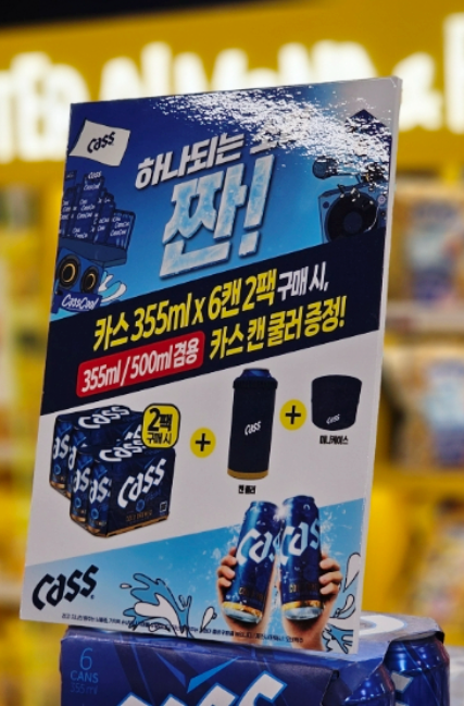 카스 캔쿨러는 굿즈 상품으로 별도로 판매하고 있지는 않습니다. 다만, 전국 홈플러스 매장에서 355ml 카스 캔맥주 6캔 번들을 2개 구매 시 캔쿨러 1개를 지급하는 행사를 진행 중입니다.